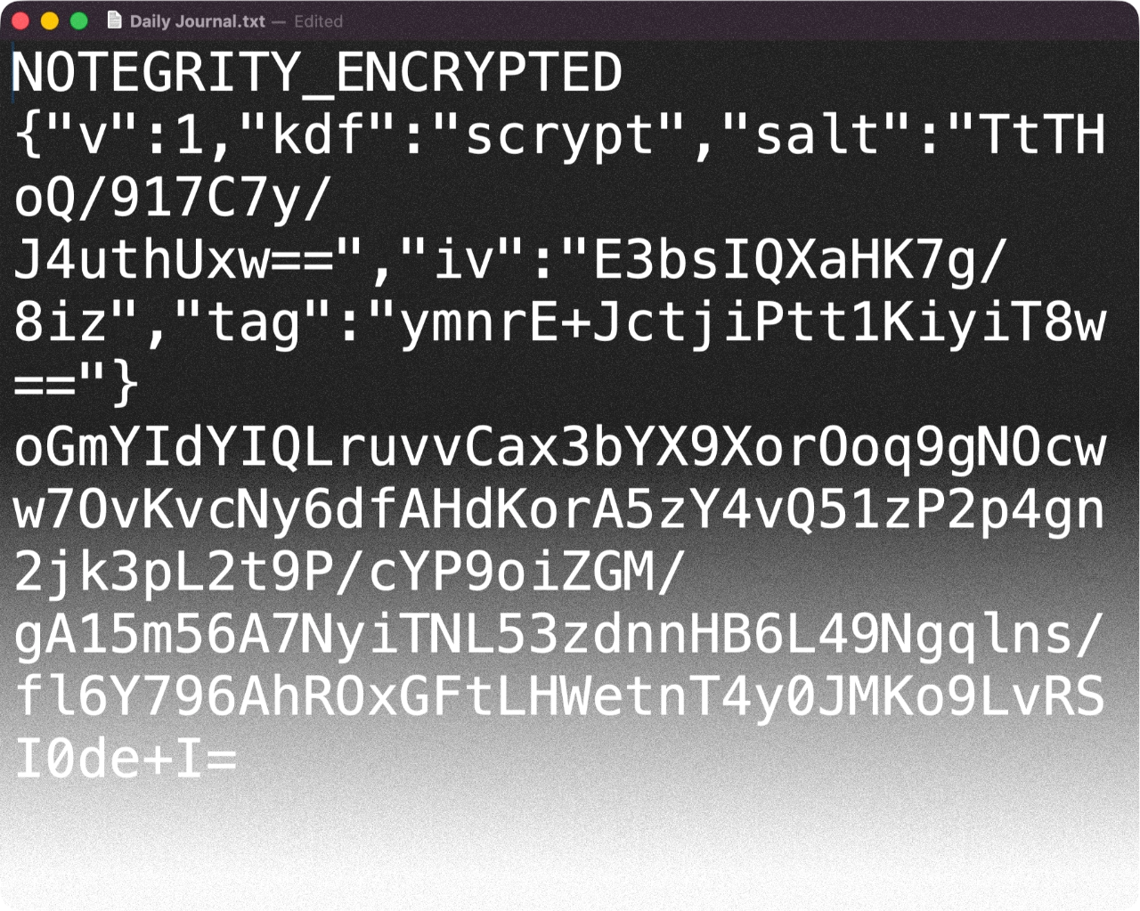 On the outside, your files appear as unreadable data. The contents only become visible when unlocked with your password in Notegrity.