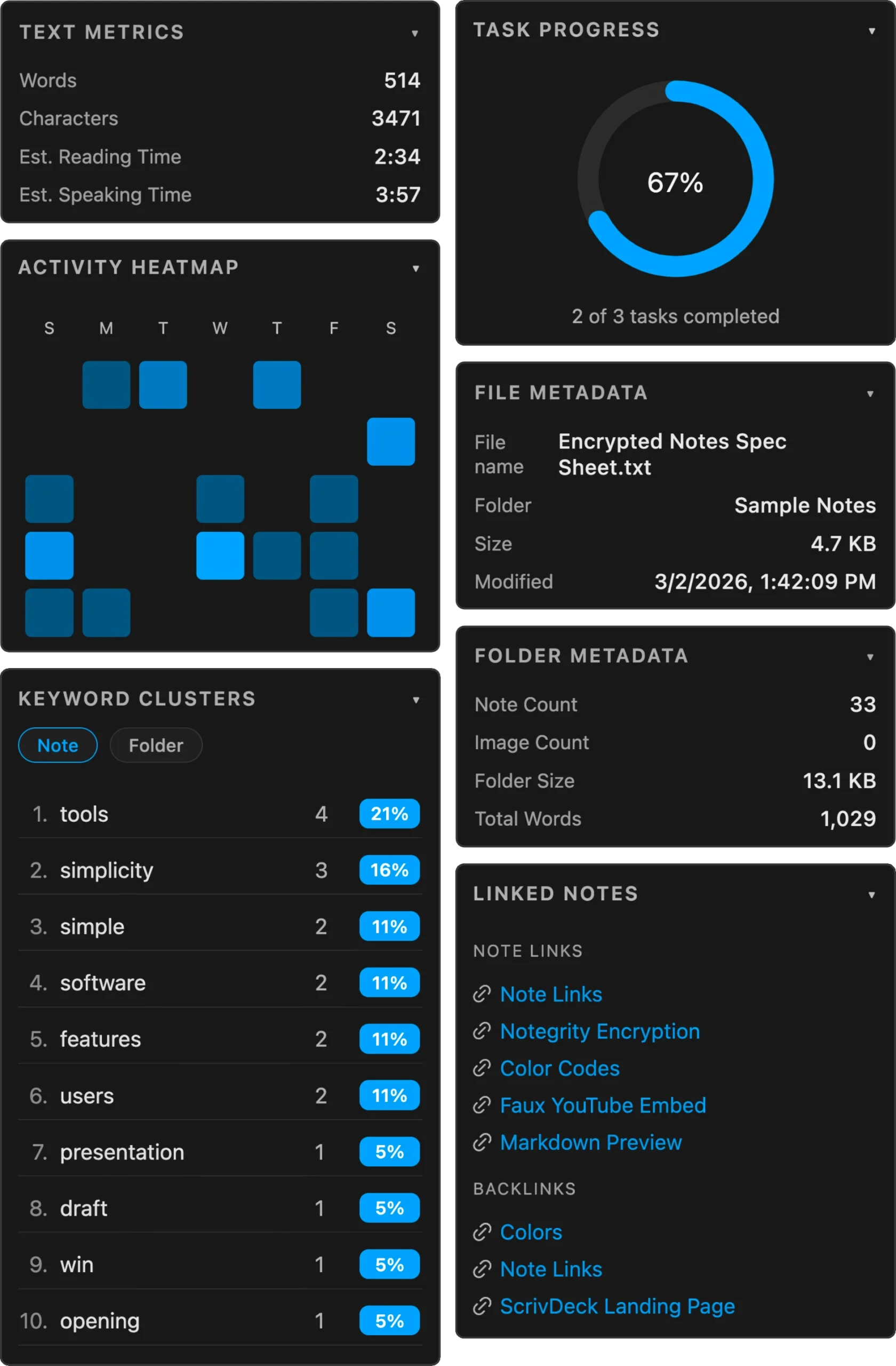 Understand the structure of your notes at a glance with word counts, reading time, file metadata, and folder statistics.