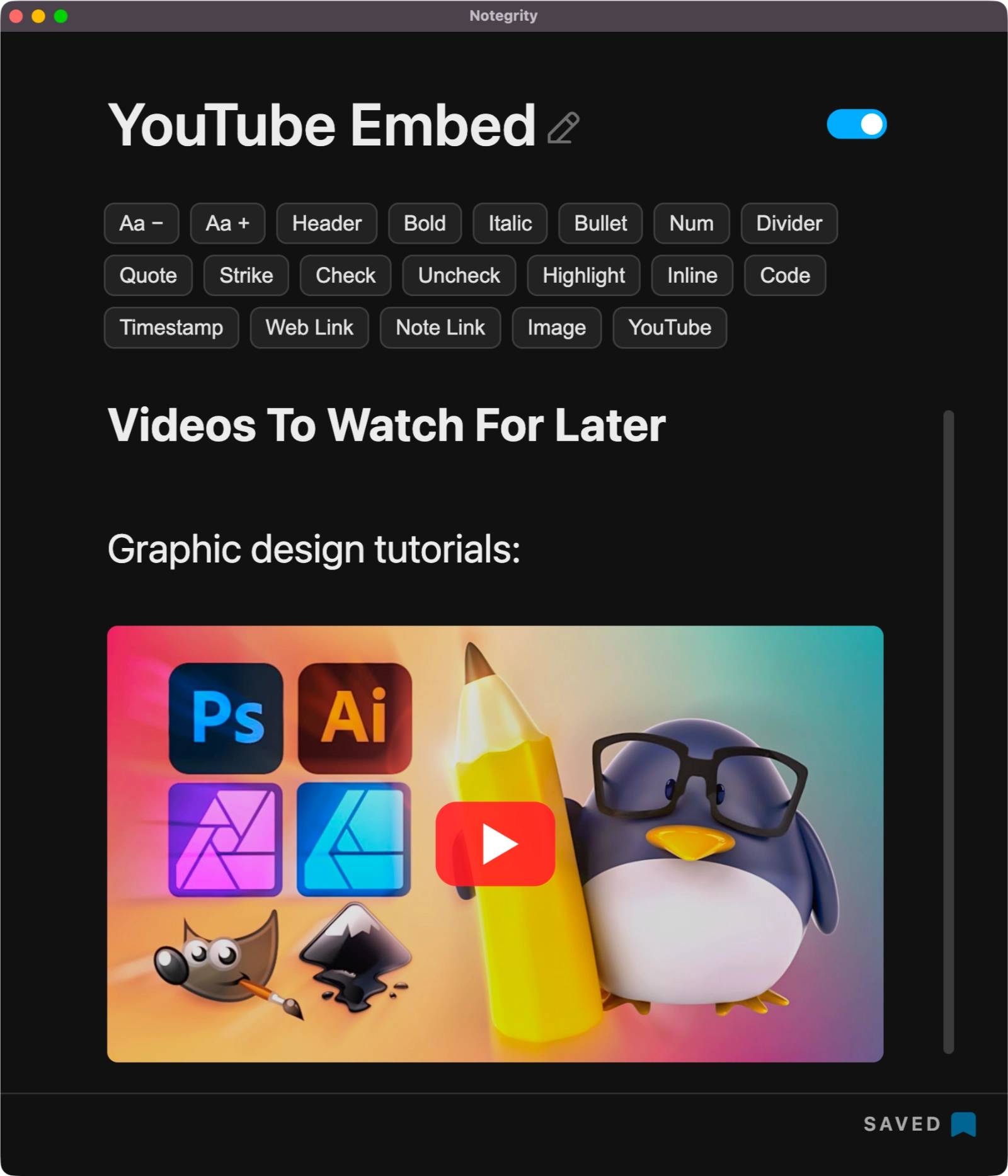 Add images and YouTube videos directly to your notes using simple Markdown syntax.