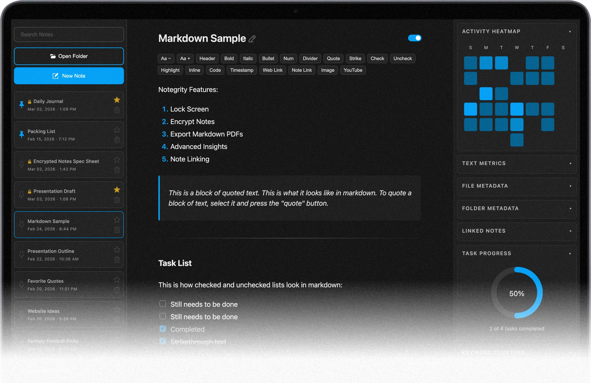 Notegrity is not currently open source. However, the application is built around open and interoperable file formats such as plain text and Markdown. Your notes are never locked inside a proprietary system and can always be accessed with other tools.