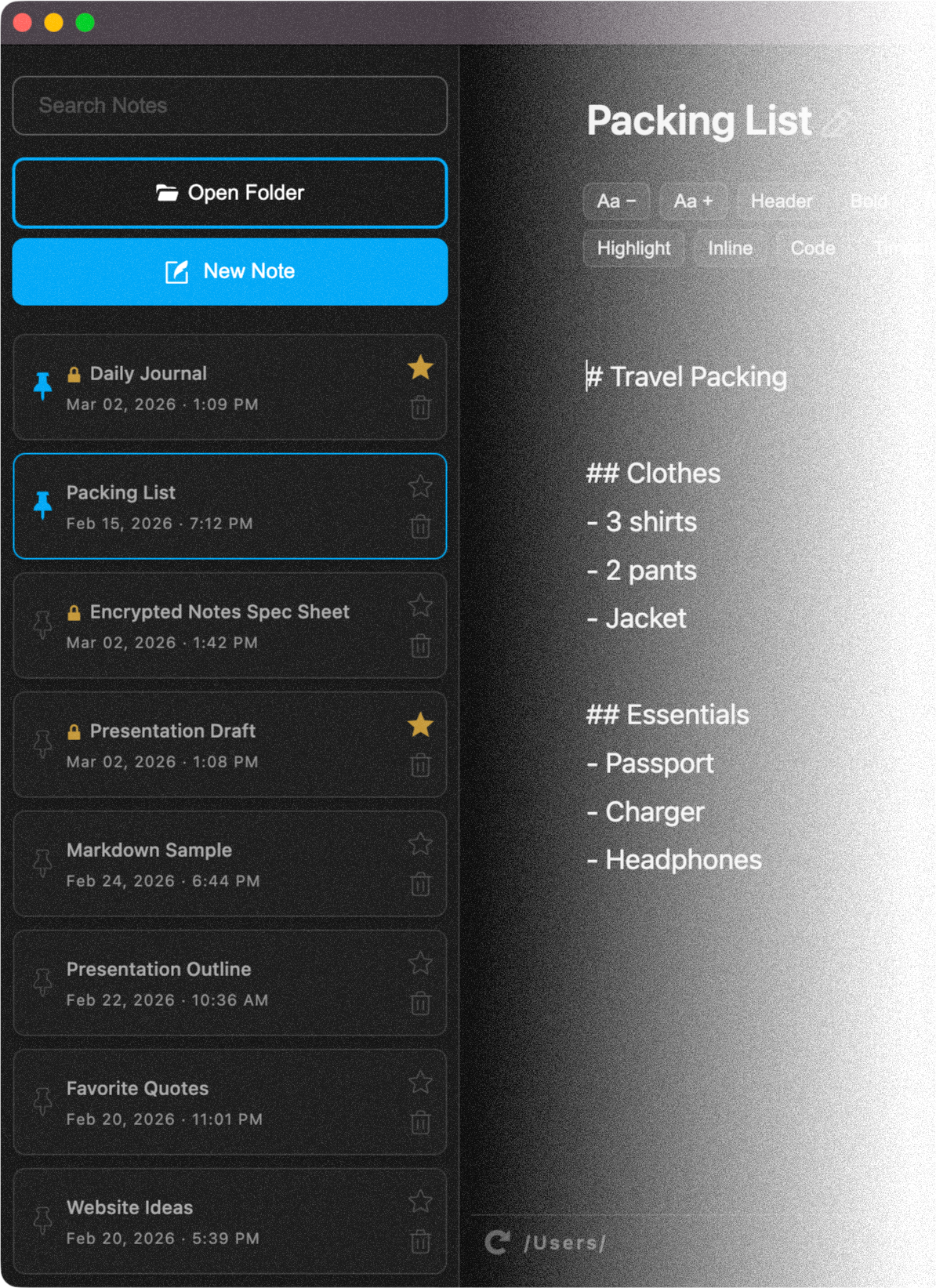 Notegrity Pro lets you encrypt note files locally and secure them with a password using industry-standard AES-256-GCM encryption and Scrypt-derived keys.